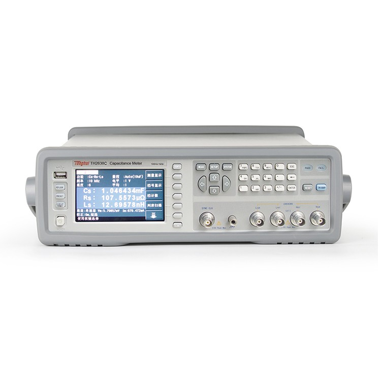 TH2638 是用于陶瓷电容生产测试的一款电容表。TH2638 可用于在频率 100Hz,120Hz, 1kHz,10kHz,40kHz, 100kHz,1MHz 和测试信号电平(0.1V ∼1V)对陶瓷电容作出评估。 TH2638 可提供在所有频率下基本精度为±0.07%(C)、±0.0005(D)的 C-D 测量, 且在每个范围内都具有七位数的分辨率(损耗因数分辨率为 1 ppm)。 利用其内置的比较器,TH2638 可输出比较/判定结果,用于将元件分类为最多 10 个分 档(BIN)。此外,通过使用处理器接口和扫描仪接口选件,TH2638 很容易与元器件处理器、 扫描仪和系统控制器结合使用,以使元器件测试、分类和质量控制数据处理实现全自动化。 GPIB/LAN/USB 接口是 TH2638 上的标准接口(TH2638A/B/C 不包含 GPIB 和 Scanner 接口),并支持自动测试。 应用 ■ 电解电容器高速高精度测试 ■ 陶瓷电容器高速高精度测试 ■ 薄膜电容器高速高精度测试 ■ 各种电容器生产线高速测试 ■ 高速自动化生产线集成测试 ■ 半导体、器件、材料分布电容测试 性能特点 测试频率:最高10kHz,4频点 精度:容量C:±0.07%,损耗D:±0.0005 测试速度:最快2. 3ms/次,5档速度选择 11档分选,PASS/FAIL指示,档计数功能 超稳定的ESR 1μΩ读数分辨率 10点列表扫描,可对频率、电压进行扫描 V、I测试信号电平监视功能 低阻抗测试,信号电平补偿功能 内部文件存储和外部U盘文件保存 测量数据可直接保存到U盘 截屏保存到U盘 兼容SCPI命令集 RS232C、USB CDC、 LAN、GPIB接口 HANDLER接口、SCANNER接口、机械手接口 接触检查功能 同步信号源 技术参数