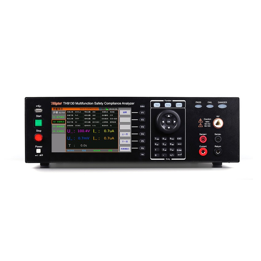 TH9130系列多功能安规综合分析仪是针对电子电器设备的全性能安规测试所设计的仪器。包含交/直流耐压、绝缘电阻、接地电阻、导通测试、电气性能及泄漏电流等多个安规测试功能。