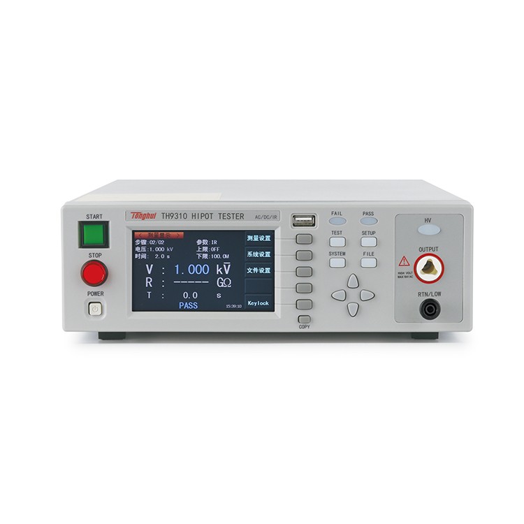 TH9310交直流耐压绝缘测试仪是一款小功率经济型智能安规测试仪器。体积小、重量轻、外形美观、操作简便。TH9320产品可广泛应用于家用电器、变压器、电气设备、元器件的安全性能检查。 应用 ■ 自动化测试系统 ■ 家用电器 ■ 变压器、电机 ■ 电气设备 ■ 电热器具 ■ 照明行业 ■ 新能源汽车 ■ 电子元器件 ■ 医疗设备 技术参数 型 号 | TH9310 | 耐压测试 | 输出电压 | AC | 0.05— 5.00kV±(2%读数+5个字),频率50Hz、60Hz可面板选择 | DC | 0.05— 6.00kV±(2%读数+5个字) | 电压调整率 | ≤(1%- 5V)(额定功率) | 电流测试范围 | AC | 0mA - 10.00mA ±(2%读数+2个字) | DC | 0mA - 5.00mA ±(2%读数+2个字) | 快速放电功能 | 测试结束后自动放电(DCW) | 绝缘电阻测试 | 输出电压 | 0.10kV-1.00kV±(2%读数+2V) | 电阻测试范围 | 0.1MΩ-10.0GΩ | 电阻测试精度 | 500V-1000V | 1MΩ-1000MΩ ±(5%读数+2个字) 1000MΩ-9999MΩ ±(10%读数+2个字) | 100V-500V | 1MΩ-1000MΩ ±(10%读数+2个字) | 放电功能 | 测试结束后自动放电 | 电弧侦测 | 测量范围 | AC | 1- 9级 (出厂默认值为5)(对应电流 20mA、18mA、16mA、14mA、12mA、10mA、7.7mA、5.5mA、2.8mA) | DC | 1- 9级 | 一般参数 | 存储器 | 20个测试文件,每个文件可存储20个测试步骤 | 电压上升时间 | 0.1s - 999.9s | 测试时间设定(AC/DC) | 0.2s - 999.9s | 电压下降时间 | 0.1s - 999.9s | 等待时间(IR) | 0.2s - 999.9s | 时间精度 | ±(1%+0.1s) | 接口 | | 标配 | HANDLER,RS232,USBDRV(电脑接口),USBHOST(系统升级接口) |