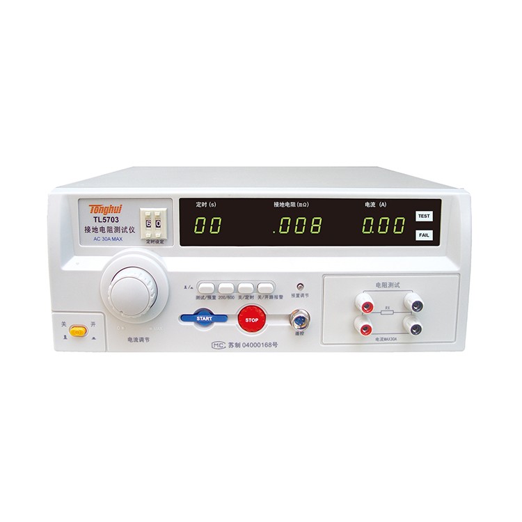 TH5703型接地电阻测试仪是用来测量电气设备内部的接地电阻,它所反映的是电气设备的各处外露可导部分与电气设备的总接地端子之间的(接触)电阻。接地电阻测试仪为了消除接触电阻对测试的影响,采用四段测量法,即在被测电气的外露可导部分和总接地端子之间加上电流,然后再测量这两端的电压,算出其电阻值。本产品满足GB4706.1-2005,GB9706.1-2007等国内外安规标准测试,符合JJG984-2004安规计量检定规程要求。 性能特点 测试电流:0-30A 接地电阻范围:0-200/600mΩ 测试电流,测试电阻,测试时间同时显示 测试时间可任意设置 测试报警值可连续任意设置 声光报警 技术参数
