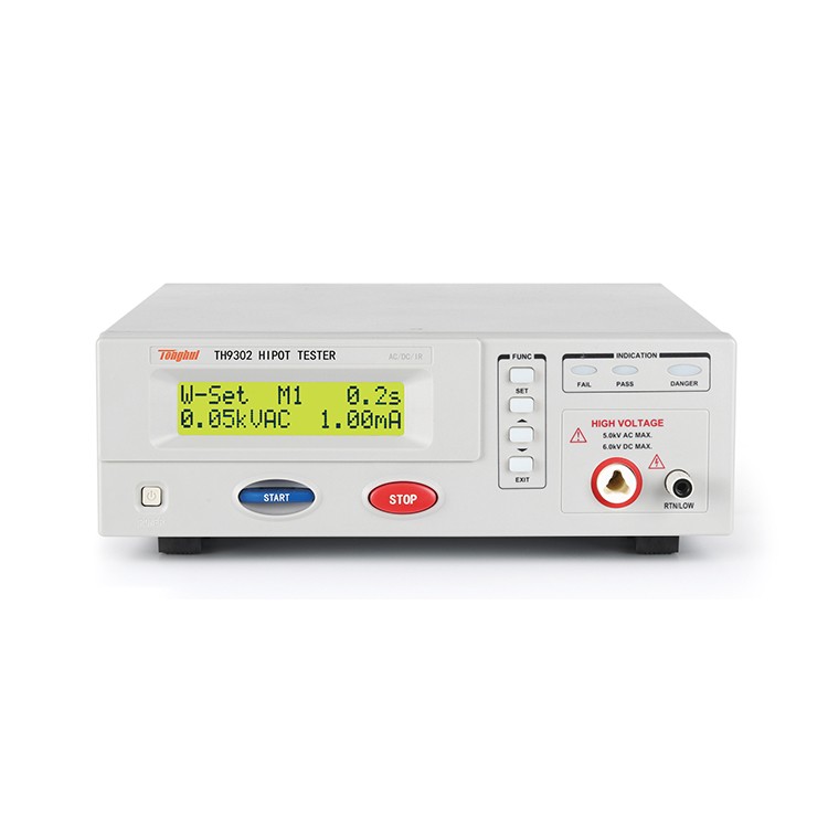 应用 ■ 自动化测试系统 ■ 家用电器 ■ 变压器、电机 ■ 电气设备 ■ 电热器具 ■ 照明行业 ■ 新能源汽车 ■ 电子元器件 ■ 医疗设备 性能特点 简易的可操作性 6种测试项目或组合,9个测试存储区 接触检查功能(TH9302C、TH9302D) RS-232C界面作为标准 继电器输入输出HANDLER接口,支持PLC 外部控制接口,支持同步或远程控制 电压上升时间:0.1s-999.9s 测试等待时间:0.1s-999.9s 技术参数 产品型号 | TH9302 | TH9302C | TH9302B | TH9302D | 耐压测试 | 电压输出 | AC | 电压范围 | 0.10kV—5.00kV | 电压波形 | 正弦波 | 失真度 | <3% | 工作频率 | 50、60Hz可选 | 频率精度 | ±1% | 输出功率 | 60VA(5.00kV/12mA) | 电压调整率 | ±(2.0%+50V)(额定功率) | DC | 电压范围 | 0.10kV—6.00kV | ------ | 信号源频率 | 600Hz | ------ | 输出功率 | 25VA(5.00kV/5mA) | ------ | 电压调整率 | ±(2.0%+100V)(额定功率) | ------ | 电压分辨率 | 10V | 电压精度 | ±(2.0%设定+20V) | 电压产生方式 | DDS信号源加AB类功放 | 电流测试 | AC | 电流范围 | 0.01mA–10mA | 短路电流 (瞬间) | >20mA(设定输出电压>500V) | 电流分辨率 | 0.01mA | 电流精度 | ±(2%读数+2个字) | 实际电流 | OFF-0.01mA-10mA | DC | 电流范围 | 1mA–5.00mA | ------ | 电流精度 | ±(2.0%读数+2个字) | ------ | 放电功能 | 测试结束后自动放电DCW) | ------ | 绝缘电阻测试 | 输出电压 | 0.10V–1.00kV | ------ | 电压分辨率 | 10V | ------ | 电压精度 | ±(2.0%读数+10V) | ------ | 最大输出电流 | 5mA | ------ | 输出瞬间短路电流 | >10mA(设定输出电压>500V) | ------ | 负载调整率 | ≤1%(额定功率) | ------ | 电阻测量范围 | 0.02MΩ–10GΩ | ------ | 电阻显示量程 (1000V) | 5mA 0.2MΩ-1MΩ 1mA 1MΩ-10MΩ 100uA 10MΩ-100MΩ 10uA 100MΩ-1GΩ 1uA 1GΩ-10GΩ | ------ | | | ------ | | | ------ | | | ------ | | | ------ | 电阻测量准确度 | ≥500V 1MΩ–1GΩ±(5%读数+5个字) 1GΩ–10GΩ±(10%读数+5个字) <500V 0.1MΩ–1GΩ±(10%读数+5个字) 1GΩ–10GΩ仅供参考无精度要求。 | ------ | 电流测量准确度 | ±(2%读数+2个字) | ------ | 电弧侦测 | 测量范围 | AC | 1mA–20mA | DC | 1mA–20mA | ------ | 比较器 | 判别方式 | 窗口比较方式(条件I下 | I下ON:当I下 | 当Ix≤I下或Ix≥I上,FAIL | I下OFF:当Ix | 当Ix≥I上,FAIL | 绝缘电阻判别方式同上 | 电流上限设置I上 | AC | 0.01mA–10mA | DC | 1uA–5mA | ------ | 电流下限设置I下 (LOWEROFF) | AC | 0.01mA–10mA | DC | 1uA–5mA | ------ | 电阻上限设置 | OFF,1MΩ-10GΩ | ------ | 电阻下限设置 | 0.1MΩ–10GΩ | ------ | 判别输出 | PASS/FAIL LCD及LED分别显示,声音报警 | 其他功能 | 后面板输出孔 | ------ | 有 | ------ | 有 | 接触检查 | ------ | 支持 | ------ | 支持 | 参数设定 | 电压上升时间 | 0.1s–999.9s | 测试时间设定 | 0.3s–999.9s(在TIMER ON时) | 时间准确度 | ±(0.2%设定值±0.1s) | 测量功能 | 键盘锁 | 防止意外修改测试条件,或禁止测试条件被修改 | 电流超量程判断 | 硬件快速判断绝缘崩溃,比电压采样更快捷安全,减少对产品的冲击损伤 | ARC电弧侦测 | 采样电流的突变信号,判断回路潜在的隐患及大概的规模 | 高压指示 | 窗口指示和LED灯指示 | 存储与接口 | 文件编程和存储 | 可编程9个测试文件 | USB接口 | 无 | 开机参数保存 | 设定参数保存为默认参数,下次开机可以自动恢复 | 控制接口 | HANDLER | 通讯接口 | RS232C,RS485 | 一般技术指标 | 工作温度、湿度 | 0℃-40℃,≤80%RH | 电源 | 100V-121V,198V-242V,47.5-63Hz | 功耗 | ≤300VA | 外形体积 | 340mm×120mm×450mm | 重量 | 约12kg | | | | | | | | | | | |