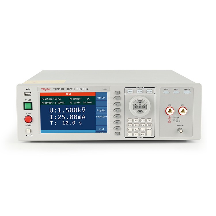 TH9110/TH9110A交直流耐压/绝缘电阻测试仪是同惠多年电气安规测试仪器设计的经验,**设计的具有500VA大功率,最大输出交流5kV/100mA,符合大功率耐压测试需求,以及符合EN50191的设备安全标准。 TH9110/TH9110A系列除了基本的交流、直流、绝缘电阻测试外,增加了崩溃电压测试功能 ,可分析产品的击穿点电压,满足特定客户对产品高压可靠性检测的要求; 同时具有开短路检测功能,解决了用户在测试安规产品时的可靠性和准确性问题,输出时同步进行接触检查,避免漏检,提升测试可靠度与效率。 TH9110/TH9110A使用7寸LCD彩色显示屏,并将测试结果用大字符显示,更加清晰直观,方便操作与判断。同时浮地输出设计、触电保护功能等,更加确保了客户即使在不小心接触到高压测试端的时候也不会被电击伤害,保护操作人员的安全,操作时无后顾之忧。 功能特点 A.耐压绝缘测试和电弧侦测(ARC) 耐压不良是指在耐压测试中,不得有电气闪络或绝缘破坏发生。现在耐压绝缘测试已经成为各类绝缘材料测试的标准配备.但是,仅仅考虑到绝缘失效并不能完全解决产品安全问题,另一类现象,如今在耐压测试中越来越得到重视,那就是放电,放电与绝缘能力之间具有极高的相关性,所以放电侦测不仅是重要的相关问题,更是控制产品质量的主要关键。 电弧放电 : 以下两种情况会出现电弧放电现象 1. 当材料承受较高电压,电场强度相对较大,电场强度大于气体的电离能时,会让材料表面气体发生瞬时电离现象,此时会在材料表面形成打火并对材料形成温升现象。长期的打火和温升可能会造成材料的质变,进而导致绝缘劣化,使得电压耐受程度下降,最终发生绝缘失效。 2. 被测件检测点间距过小时,在被测件两端施加较高电压,检测点两端空间里的空气会被电离,形成打火现象,也就是拉弧现象。