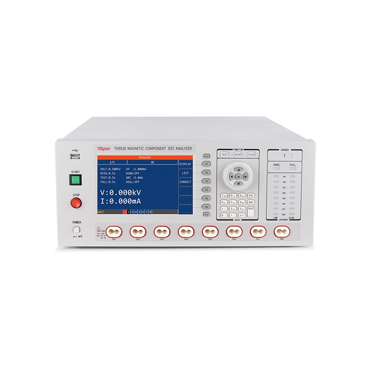 TH9520/A综合分析系统在单机内实现交流耐压、直流耐压、绝缘电阻、匝间绝缘测试、直流低电阻、电感量(TH9520A选配)测试六大功能。针对线圈类元器件需要的测试项目如安规耐压、匝间绝缘、绕线电阻值、线圈电感量(TH9520A选配),以前需要四台不同仪器分别进行测试,现在在单机内即可实现。 凭借同惠电子丰富的元器件分析技术,TH9520/A带来的不仅仅是四台普通仪器的简单叠加:500VA/200VA功率AC设计,5kV AC/6kV DC输出高压,绝缘电阻电压提高至5kV(TH9520),匝间绝缘测试电压提高至6kV(TH9520),新型高压测试夹具实现四端直流低电阻和测试频率最高至100kHz的电感量测试,新技术的实现给您的产品带来更好的品质保证。单机配备八通道扫描接口,每个通道可设置为高端、低端、关闭三种状态,可实现最多八组器件的测试,满足用户的应用需求。 TH9520/A简捷易用的操作界面,醒目的分选结果指示,完善的高压保护,丰富的接口功能,方便的的数据传输和数据保存功能,将简化您的测试流程,极大的提高产品测试效率。 功能特点 A. 500VA/200VA(TH9520A)数字化大功率耐压测试: 与模拟安规测试原理相比数字化耐压测试输出高压不受市电影响,电压品质大为提高,同时可以数字显示实时的测试电压,达到更精准的测量与显示。而且输出电压采用自适应反馈控制,使得输出负载的变化不会造成输出电压的变化。 B. 触电保护功能 当操作人员与高压输出端接触时,仪器会监测流经人体的电流是否过高,若判定为触电,仪器会立即切断输出,保障用户的安全。 C. 开短路侦测功能(OSC) 在耐压测试过程中由于被测件与测试线接触不良、测试线损坏等,会发生开路现象,导致不良品误判为良品;被测件损坏或者被测端间距太小导致测试线短路现象。 使用OCS功能,TH9520/A可预先侦知测试端开短路情况,减少产线接触不良的问题发生,保护治具设备,节省测试成本。