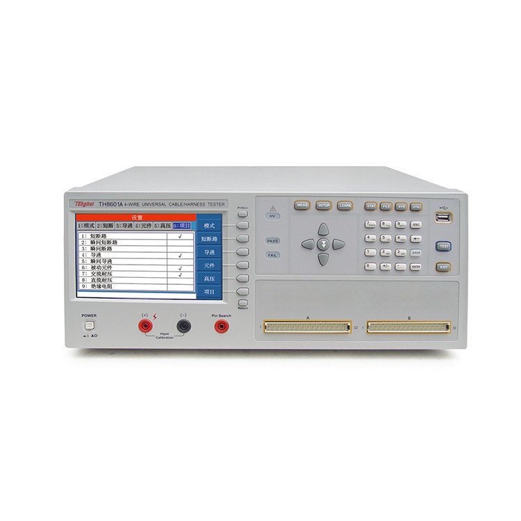 TH8601系列四端线材综合测试仪是专用于各种线缆,线束和排 线品质及连接可靠性检验的多功能,自动化的线材综合参数测试 系统。该系统提供可编程的恒流恒压源以及高压源,测试项目涵盖了导通,被动元件(电感,电阻,电容,二极管),交直流耐压,绝缘电阻各种高低压参数。本系统采用先进的LCR数字采样及高速长寿命通道切换技术,大大提高了测试精度,速度以及使用寿命。采用高低压分离技术,大大的提高绝缘电阻的测试性能。丰富的接口设计,本仪器还提供RS232, RS485, GPIB, USB, LAN, Handler等接口,便于用户运用于自动化检测和自动化产线。 应用 ■ 通讯和IT 电话线、网络连接线、多股连接线、手机屏线、TYPEC数据线、 USB数据线、笔记本电脑屏线、HDMI连接线、VGA连接线、IDE 硬盘连接线、SATA硬盘连接线等 ■ 汽车电子 ECU连接线、汽车线束、导航连接线、导航屏线、车载电子产品 连接线、音视频连接线 ■ 电子工业 排线、扁平线、接插件、电源线、多路开关、RS232连接线、 GPIB连接线、USB延长线、多芯插座 ■ 元器件 无源器件:电容、电感,电阻,二极管 ■ 安规测试 多路耐压、绝缘 性能特点 交流50Hz-100kHz 测试频率,0.1%精确度直流0V-5V测试幅度,10%精确度 最多64P脚位进行扫描和测试大于100G的自身绝缘阻抗 7寸TFT LCD真彩显示器,800X480分辨率,16位色 Cotex_M3处理器核心 中英文可选操作界面 RS232, RS485, GPIB,USB, LAN, Handler等接口选择 USB接口用于存储设置文件,存储测试数据,程序升级 技术参