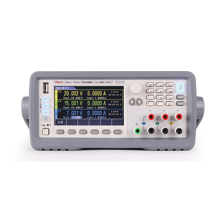TH6400系列多路输出可编程直流电源涵盖了5个型号(单个通道功率范围5W-180W),其中TH6402B为4通道输出,其余型号为3通道输出。全系列电源具备通道间串、并联以及同步输出功能,并且所有通道的输出参数同屏显示,使用起来更加方便、直观。TH6400系列电源均为线性、程控输出设计,因此该系列电源具有纹波小、噪声低、精度高、稳定性强的**性能。全系列采用4.3寸TFT LED显示屏,不同通道分屏显示,并以高对比度的颜色加以区分。UI设计方面仪器采用菜单化操作,软键、旋钮控制及输入参数,使用起来方便快捷,能很好的适应产线快速操作以及高校、实验室的应用需求。 TH6400系列标配了RS232、USB HOST和USB DEVICE接口,可选配GPIB接口(TH6402A所有接口都为选配),支持SCPI和MODBUS通讯协议,可方便地选购上位机软件或者自行编辑以满足系统集成的需要。小体积、标准机箱尺寸加上前后面板都可输出的设计特点,使得TH6400系列电源可以方便地集成在标准机柜里面。 功能特点 A. 多通道输出 TH6400为全系列多路输出的矩形电源,其电压电流精度分别达1mV和0.1mA。通道间串联、并联、同步输出自由组合。在同步模式下,改变其中一个通道的设定值,其他同步的通道也将按比例随之自动变化。