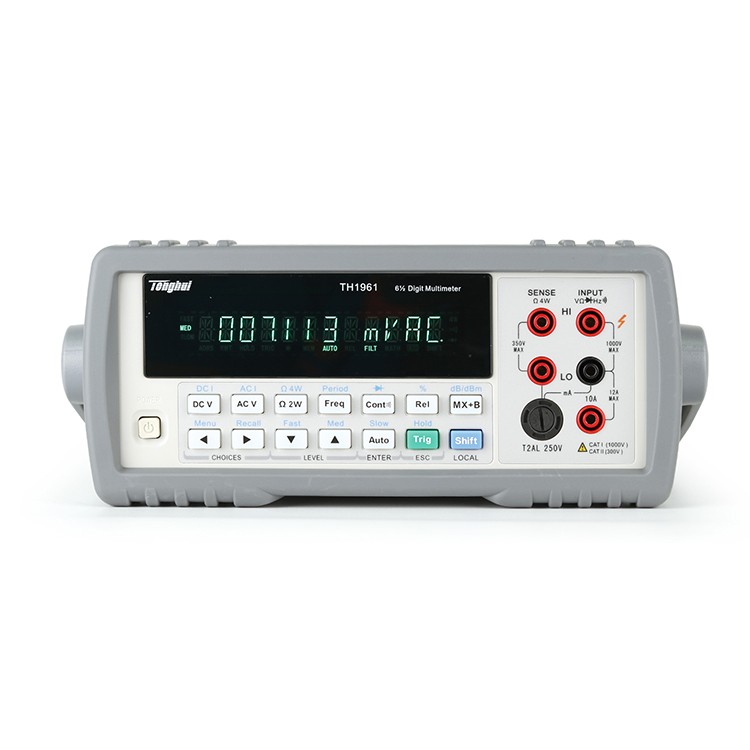TH1961型6 1/2位数字多用表是一种快速、的电压/电流/电阻测试仪器,仪器提供1,200,000字读数,1000次/秒的快读数速率,0.0035%的直流电压准确度等一系列优良的性能和经济的价格为广大客户提供的选择。TH1961简洁的前面板设计使您能快捷地得到所需测量功能,大字符高亮度VFD显示器使测试观察一目了然。仪器具备12种测量功能,包括直流电压/ 电流、交流电压/ 电流、2 线/4 线电阻、频率/ 周期、导通、二极管测量、dB/dBm功能,涵盖了基本的电量测试需求。本仪器采用多项新技术,如高速低噪声的26位A/D转换技术,使该表具备很好的线性度和低噪声特性,快速伺服响应放大器、浮动电源及低漂移缓冲放大器构成伺服前端,达到消除传统衰减、减小零点漂移、提高测量速度的目的。机内采用SMD器件以减小整机密度,降低体积。本仪器采用专门的输入过载保护电路,使输入端到地可承受1500伏的高压,且一旦过载后可快速恢复,从而保证仪器的安全性及可靠性。TH1961配备标准的USB RS232C和GPIB接口,同时可提供通用的通讯软件以满足您与计算机通讯、数据分析、统计,构建自动测试系统的需要。仪器接受SCPI(可编程仪器的标准命令)命令,以保证通讯软件的兼容性。 性能特点 6 1/2位1, 199, 999字读数 测试速度:最高1000次/秒 DCV/ACV、DCI/ACI、Ω2W/Ω4W、频率/ 周期、二极管、导通、dB/dBm等十二种测量功能 真有效值交流电压和电流测量,频宽高达100kHz/300kHzDCV测量准确度高达0.0035%,分辨率达0.1μV 等精度频率测试高达1MHz以上 零点偏移(REL)测试模式消除残余读数 2线(2W)、4线(4W)电阻测试模式选择 内置mX+b,%,dB, dBm等数学运算功能 可存储512个读数,并执行MAX/MIN/AVER/STD统计 最高可存储30000个读数 极限功能(HI/IN/LO)用于快速测试分选 高亮度真空荧光管VFD显示 USB GPIB RS232C接口提供方便的系统通讯方式 提供10组仪器状态供存储/调用 技术参数