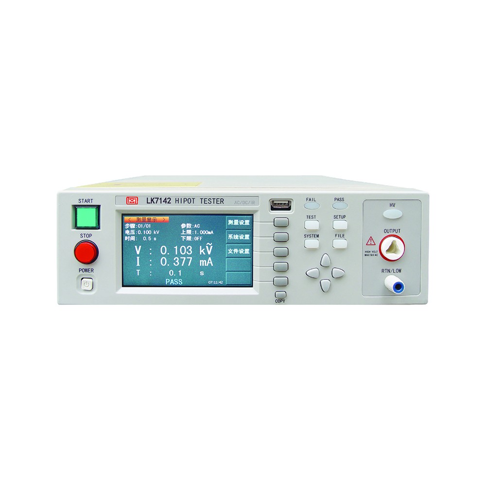 简要介绍 LK系列交直流耐压绝缘测试仪是一款小功率经济型智能安规测试仪器。体积小、重量轻、外形美观、操作简便。LK系列产品可广泛应用于家用电器、变压器、电气设备、元器件的安全性能检测。 性能特点 ■输出功率:AC:5kV/10mA:DC:6kV5mA(LK716X系列) AC:5kV/20mA:DC:6kV/10mA LK7142 ■绝缘电阻测试电压:0.10kV一1.00kV ■绝缘电阻测试范围:0.10MQ一10.0GΩ ■480×272点,TFT-LCD显示 ■快速放电和电弧侦测功能 ■999.9秒内任意设定的电压上升时间,测试时间,针对绝缘电阻有可随意设定测试等待时间 ■可存储20个测试文件,每个文件可存储16个测试步骤,任意步骤可选择任意测试模式 ■全新的面板和简洁的界面操作设计 ■锁键盘功能 ■PLC接口 技术指标