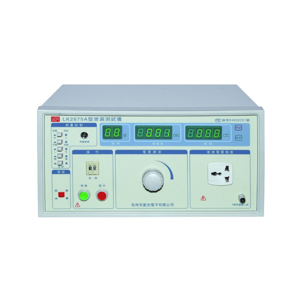 简要介绍 LK2675X系列泄漏电流测试仪是用于测量电器的工作电源(或其它电源)通过绝缘阻抗或分布参数阻抗产生的与工作无关的泄漏电流。其输入阻抗模拟人体阻抗,产品适用于家用电器和电机、电子仪器等其他电器产品的安全测试需求,也是实验室、技术监督部门不可缺少的检测设备。 性能特点 ■测试电压、泄漏电流、测试时间同时显示 ■测试报警值可连续任意设定 ■相位自动转换 ■超限声光报警 ■测量频宽可达1MHZ ■灵活的一体式和分体式结构适合于各种容量的检测设备 技术指标