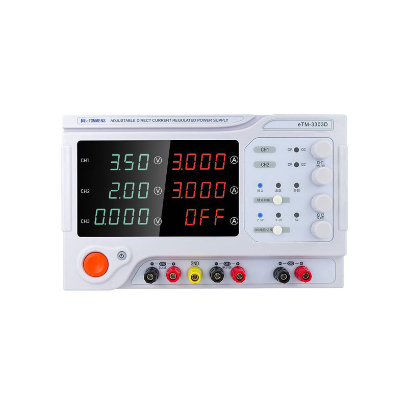 多路稳压稳流电源有两路可调输出、一路固定输出2.5V/3.3V/5V; 采用纯铜环型变压器,效率高,发热小。无须外接连线即可实现主通道CH1、CH2间的串并联,简化连线,使测试更简便。四位数码屏显示,具备10mV/1mA高精度分辨率,同时具备多种保护功能;一键控制输出通断开关,方便安全。广泛应用于产品老化维修,电池充电、实验测试、生产测试、电解电镀等行业。 产品功能及优势 多路稳压稳流电源有两路可调输出、一路固定输出2.5V/3.3V/5V; 采用纯铜环型变压器,效率高,发热小。无须外接连线即可实现主通道CH1、CH2间的串并联,简化连线,使测试更简便。四位数码屏显示,具备10mV/1mA高精度分辨率,同时具备多种保护功能;一键控制输出通断开关,方便安全。广泛应用于产品老化维修,电池充电、实验测试、生产测试、电解电镀等行业。 面板说明