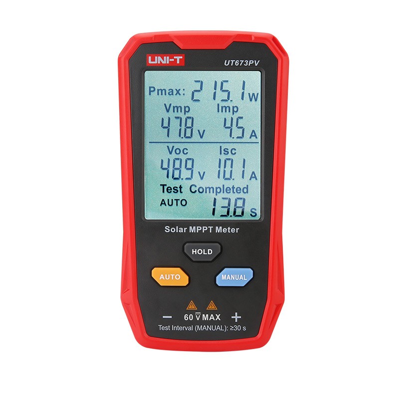 UT673PV 光伏组件最大功率测试仪 UT673PV是一款能够快速便捷测量光伏面板最大功率跟踪点(MPPT)的光伏组件最大功率测试仪,可同时测量光伏组件的最大功率Pmax,开路电压Voc和短路电流Isc并在一个界面显示所有参数。该仪表的最大功率跟踪点(MPPT)是衡量光伏面板发电低效的最重要指标,通常用于光伏板的测量或故障模块的排查。 广泛应用于:产品适用于光伏面板生产、销售、验收、安装、维护检测.