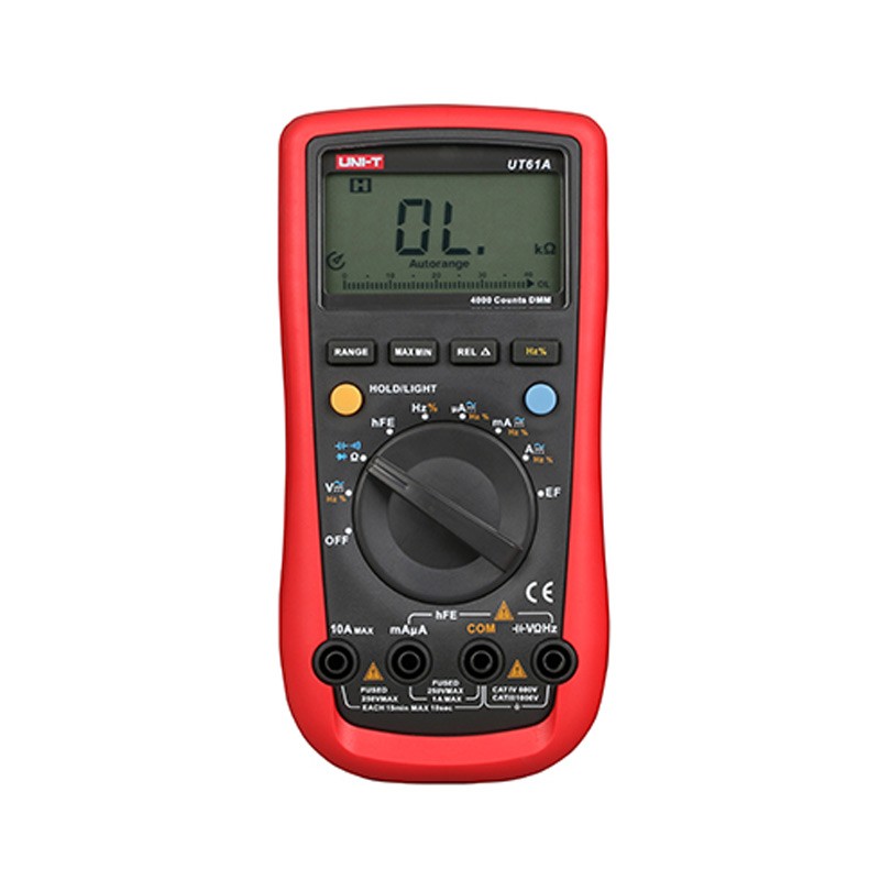 | UT61A产品主要特点 直流电压1000V测量 交流电压750V测量 交直流电流10A测量 40MΩ大电阻测量 电容测量4000uF 频率测量 二极管/三极管测量 通断蜂鸣 自动关机 低电压显示 |