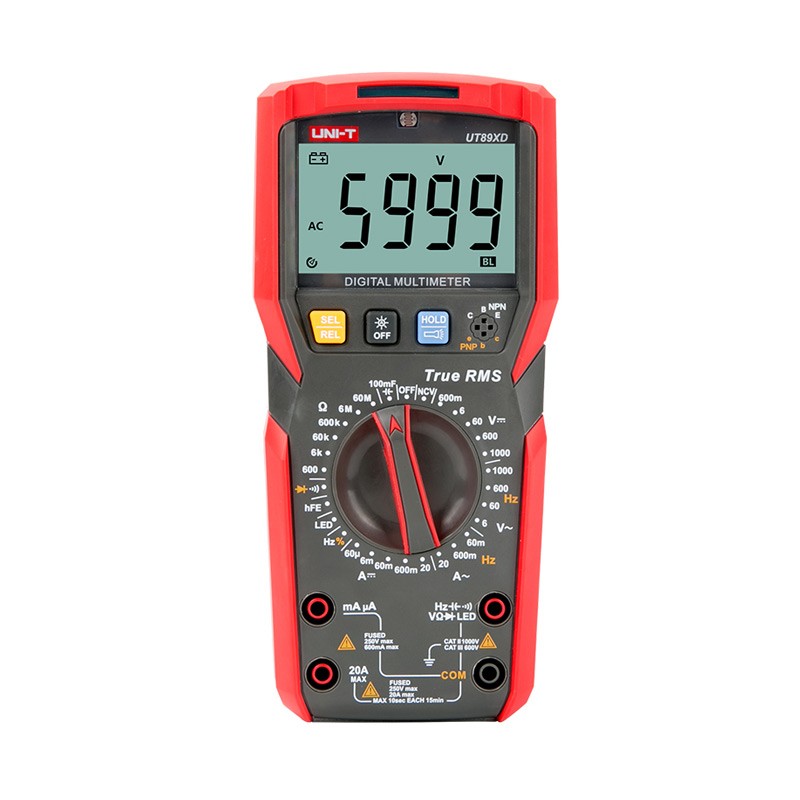 优利德UT89X系列专业NCV数字式万用表可解决客户面临的一个由来已久的问题 –– 如何快速精准区分零火线? UT89X系列根据检测电压的高低会呈现3种不同颜色的灯光提示,可用于精确区分零火线,具有相当高的泛用性。 UT89X具备可用于暖通空调系统检测工作的温度测量功能,UT89XD配备了LED发光二极管检测功能,可对LED的使用情况进行检测,诊断其好坏。 同时UT89X系列还具备传统万用表测量交直流电流电压、电阻、二极管、三极管、电容、频率、占空比等功能,功能齐全,性能稳定。