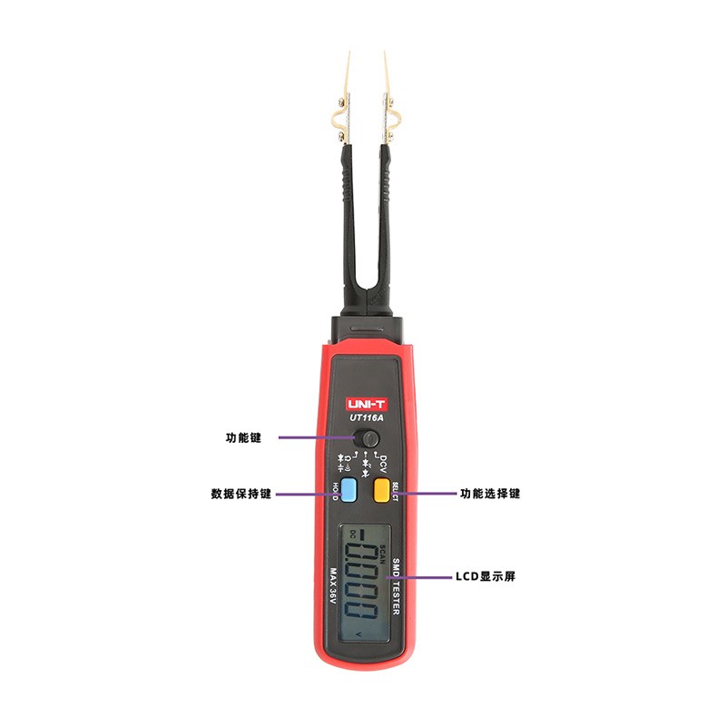技术参数 UT116A | 功能 | 量程 | 分辨力 | 准确度±(a%读数+b%字数) | 电阻 | SCAN模式 | Ω模式 | | | | 300Ω | 300Ω | 0.1Ω | ±(1.5%读数+5) | | 3kΩ | 3kΩ | 1Ω | | | 30kΩ | 30kΩ | 10Ω | | | 300kΩ | 300kΩ | 100Ω | | | 3MΩ | 3MΩ | 1KΩ | | | | 30MΩ | 10KΩ | ±(2.5%读数+5) | 电容 | SCAN模式 | F模式 | | | | 3nF | 3nF | 0.001nF | ±(2.5%读数+5) | | 30nF | 30nF | 0.01nF | | | 300nF | 300nF | 0.1nF | | | 3uF | 3uF | 1nF | | | 30uF | 30uF | 10nF | | | 300uF | 300uF | 100nF | ±(5%+5) | | | 3mF | 1uF | ±(5%+5) | | | 30mF | 10uF | 仅供参考 | 通断测试 | ≤30Ω发声,≥100Ω 蜂鸣不响,30Ω到100Ω可响可不响 | 二极管 | 正向4148:500mV~800mV。开路电压约3.0V,测量电流约2mA | 电池测量 | 无 | 直流电压DCV | SCAN模式:36V;DCV模式;36V;分辨力:0.001V;准确度:±(1.5%读数+5) | 半导体/LED | 开路电压: 约21V, 如显示电压超过21V不会损坏被测半导体或LED;电流: 约5mA | SELECT | 有 | HOLD | 有 | 睡眠功能 | 约10min,待机电流<20uA,短按任意按键唤醒 | 低压检测 | 约 < 2.3V显示“低电量”符号 | 电源供给 | 1.5V(AAA)×2电池 | 机身颜色 | 红色+灰色 | 标准配件 | 备用测试钳臂2只,1.5V(AAA)电池2只,使用说明书一份,专用测试线一副 | 机身尺寸 | 204mm×33mm×25mm | 机身重量 | 80g | 标准包装 | 彩盒 | 标准包装数量 | 60 | 标准包装尺寸 | 440mm×420mm×210mm |