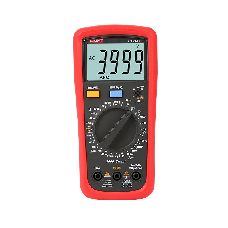 UT39+ 系列是一款便携式万用表,产品采用新一代智能ADC芯片,具有测量过压、过流报警提示,电路配备完善的防高压误测装置;符合安规CAT Ⅱ 1000V/CAT III 600V要求,是商业、工业电工界优先选择的数字万用表。