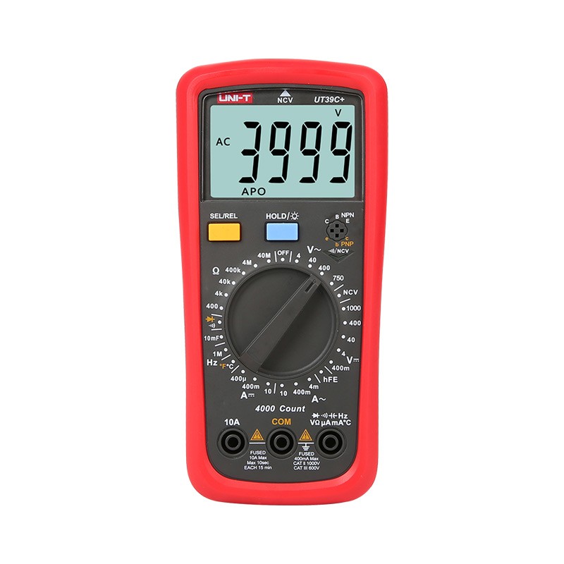 UT39C+ 是一款便携式万用表,具有测量过压、过流报警提示,电路配备完善的防高压误测装置;符合安规CAT Ⅱ 1000V/CAT III 600V要求,是商业、工业电工界优先选择的数字万用表。
