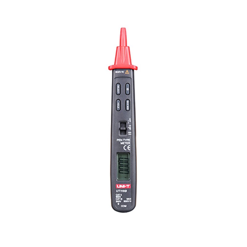 UT118系列笔式万用表(UT118A/B)具有3000位计数功能,(UT118C)具有6000位计数功能,整机电路设计以专用高性能万用表IC为核心,具有智能化、高精度、高性能之特点,能完成测量或测试;AC/DC(交流/直流)电压、EF功能(UT118B/C型)、NCV非接触验电(UT118C)、电阻、二极管、导通性、电容、频率、占空比等参数。具有双重绝缘保护。