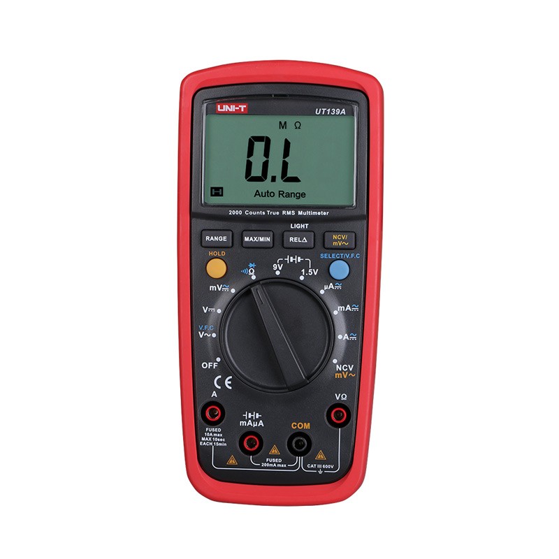 UT139A 数字万用表 UT139系列真有效值数字万用表是具备高可靠性、高安全性、自动量程、手持式万用表等特点。具有超大屏幕数字和高解析度功能,全量程过载保护和独特的外观设计;并且具有变频器VFD(Variable-frequency Drive)测量功能,可稳定测量存在高频干扰信号的变频电压或电流场合;结合真有效值测量、数据保持、相对测量、最大/最小值、欠压提示、背光和自动关机功能,使之成为性能更为**的新一代实用电工测量仪表。可用于各类大专院校、冶炼、通讯、制造、石油、电力、代工、电路电力设备的检测、维护和维修的理想工具。