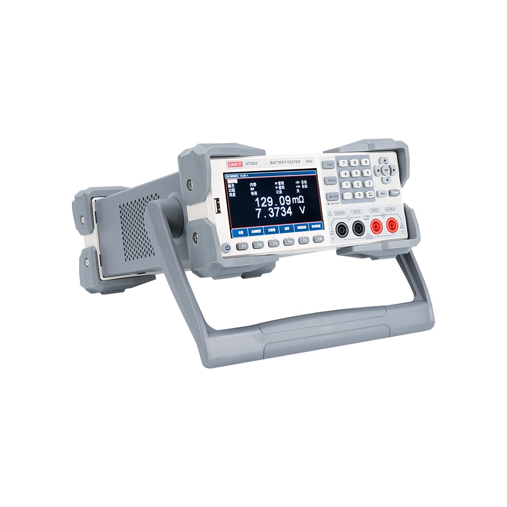 UT3500B系列电池内阻测试仪包含一个型号UT3562B, 其电压测量范围为100V,电阻测试范围为0.0001mΩ~3.2kΩ。4.3英寸大屏幕LCD显示,电池内阻和电压可以同时显示。仪器具有高精度、高分辨率及超高速测量特性,提供0.5%的电阻准确度和0.01%的电压准确度,最高测量速度可达到65次/秒。同时标配通用数据采集软件,可将测试数据读取至计算机中,并记录在普通表格软件和CSV文件中。适用于时间间隔测量和使用触发键及外部触发的手动测量,可有效运用于远程控制和数据采集与分析。可以用于专业分选,电阻和电压分别独立的比较功能,可进行HI/IN/LO的判断。判断结果可进行画面显示、蜂鸣、外部I/O输出。可自动判断电池参数是否符合标准,统计合格率,适合各种电池的检测和分拣。仪器使用增强计算机远程控制指令集,兼容SCPI,高效完成远程控制和数据采集功能。