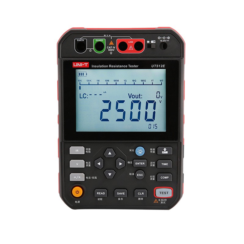 UT512E 2.5kV绝缘电阻测试仪 UT512D/UT512E是数字式高压绝缘电阻测试仪,具有250V,500V,1000V,2500V的高压输出量程,各量程的输出可设置10%步进微调电压;本产品具有储存999组测试数据的功能;存储数据可以由专用USB连接线传送至PC端,测试数据也可实时传送至PC端; UT512E还有电容测量和低阻测量功能。 广泛应用于电缆、电机、发电机、变压器、互感器、高压开关、避雷器等设备的绝缘电阻测试。是电力、电信、气象、机房、油田、机电安装和维修以及工矿企业供电部门常用而必不可少的仪表。 | UT512E产品主要特点 250V,500V,1000V,2500V:4 档电压输出 极化指数测试(PI),自动吸收比测试(DAR) 绝缘电阻量程 2.5TΩ/短路电流约5.0mA 外部电压检测功能,自动监测被测物带电电压 直流电压1000V/交流电压750V测量 电容及低电阻测试 各量程以10%额定电压设置步进 测试计时器功能,自动记录测试时间 自动放电功能及高压输出警报功能 模拟条上显示绝缘电阻测试值 具有手动及自动关机功能 可设置定时器测试模式 自动电流显示 999组数据存储/USB通讯功能 5.1寸LCD屏/LCD背光功能。 电阻比较功能(COMP),可以设置绝缘电阻上下值,并有超差提示 大容量可充电锂电池组14.8V,5200mAh |