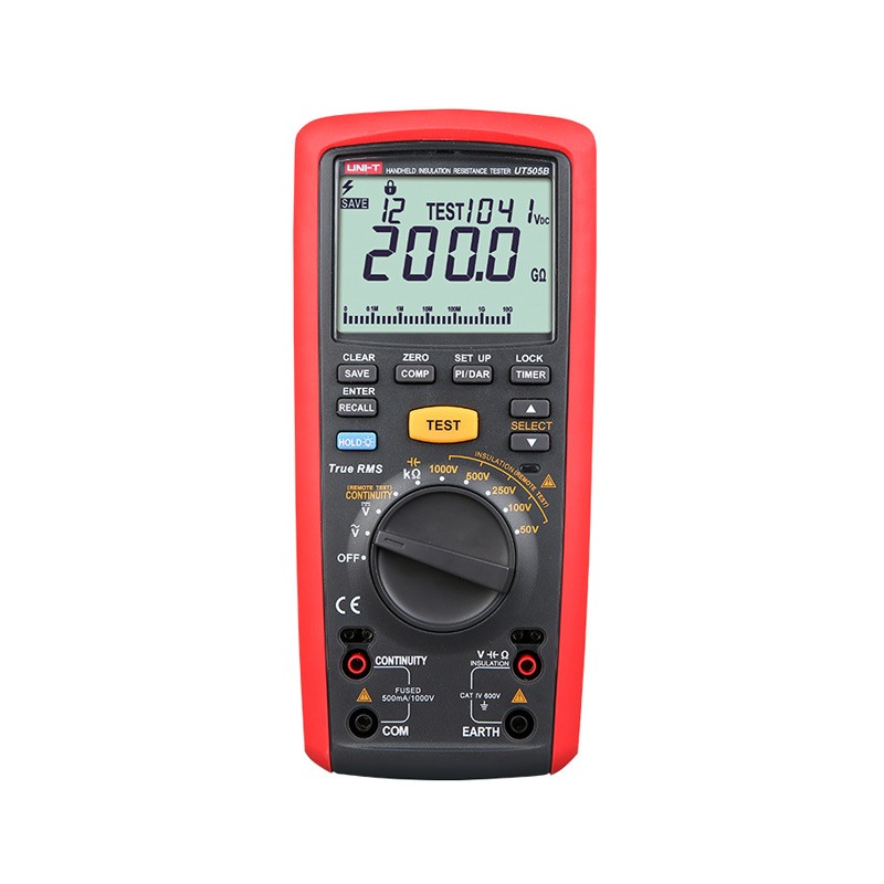 UT505B 手持式绝缘电阻测试仪 UT505B是一款集数字万用表和数字绝缘测试仪为一体的真有效值手持式绝缘电阻测试表。包含交直流电压测试(真有效值)、频率测试、电阻测试、电容测试、 CONTINUITY(连续性)测试和绝缘电阻测试等功能。具有一键测量极化指数(PI)和绝缘吸收比(DAR)功能,自动计算绝缘电阻比率,并以此数据来判定绝缘状况的优劣。应用于各种精密工具,包括电机、电缆、马达、变压器、开关、电器等各种电气设备及绝缘材料的绝缘电阻的测试,还具有漏电流显示功能、UES自检,自动保险丝检测、警告。