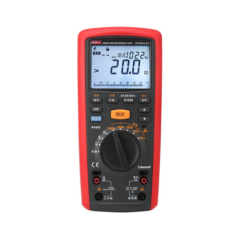| UT505A BT手持绝缘电阻测试仪产品主要特点 绝缘电阻测量:0.01MΩ~20GΩ 输出电压:50V~1000V 蓝牙数据传输功能 交/直流电压:600V,电阻测量: 20KΩ 50%~120%量程内与10%电压步进 99组数据存储/数据保持 比较测量功能 极化指数/吸收比测试 锁定/定时测量 自动关机 选配遥控表笔 |