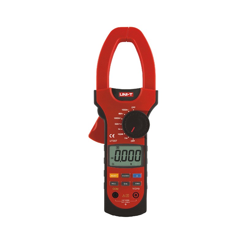 | UT207产品主要特点 霍尔效应传感器交流/直流电流1000A测量,每秒3次采样速率; 自动量程真有效值测量; 浪涌电流测量; MAX/MIN:最大值/最小值/两值差异 ; 相对值清零功能,将显示屏归零,自动减去测量参考值; 背光灯功能,应对在黑暗环境下也能有效读数; 数据保持功能,方便保持测量结果,随时读取; 自动关机、电池低压显示 ; 1米跌落; |