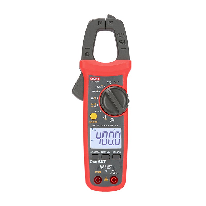 UT203+手持式自动量程真有效值钳形表,依安全标准EN61010-2010 CAT II600V/CAT III 300V等级设计,具有全功能档位防烧保护,可满足高可靠性和高安全性操作要求;产品包含电气测量的基本功能,具备高精准度测量, 高压频率测量功能,具有交/直流电流测量功能,更新颖的外观设计使之成为性能优越的电子电工优选测量工具。
