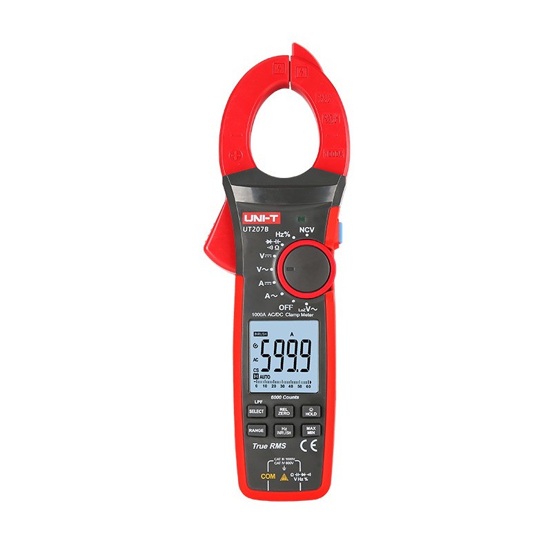 UT207B 数字钳形表 UT206B/UT207B/UT208B 真有效值数字钳形表是6000显示位数,自动量程便携手持式,整机电路设计以大规模集成电路Σ/Δ模数转换器为核心,全量程过载保护电路,独特的外观设计使之成为性能优越的电子电工专用仪表。可用于测量交直流 电压、低通滤波LPF电压,低阻抗Loz 电压、交流电流、直流电流(仅UT207B/UT208B)、电阻、二极管、电路通断、电容、频率、占空比、温度(仅UT206B/UT208B)、柔性电流探头(仅UT206B/UT208B选配)等测量功能,并具有数据保持、最大/最小值测量、相对值测量、浪涌电流测量、显示模拟条功能、手电筒功能、NCV功能、欠压显示和自动关机功能。 | UT207B产品主要特点 真有效值测量,显示位数:6000 交直流电流/浪涌电流:1000A 交直流电压:1000V 电流频率测量:40Hz~400Hz 高压频率测量:40Hz~400Hz 低压频率:10Hz~1MHz 低通滤波 (LPF)/低阻抗输入(LoZ ACV) 高压报警显示/电压超量程报警 钳头开口尺寸:42mm 安规等级CAT III 1000V / CAT IV 600V 可选配外挂柔性电流探头,可测高达3000A的交流电流 UT-CS09D(选配) |