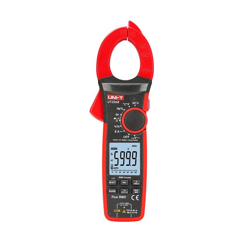 UT206B 数字钳形表 UT206B/UT207B/UT208B 真有效值数字钳形表是6000显示位数,自动量程便携手持式,整机电路设计以大规模集成电路Σ/Δ模数转换器为核心,全量程过载保护电路,独特的外观设计使之成为性能优越的电子电工专用仪表。可用于测量交直流 电压、低通滤波LPF电压,低阻抗Loz 电压、交流电流、直流电流(仅UT207B/UT208B)、电阻、二极管、电路通断、电容、频率、占空比、温度(仅UT206B/UT208B)、柔性电流探头(仅UT206B/UT208B选配)等测量功能,并具有数据保持、最大/最小值测量、相对值测量、浪涌电流测量、显示模拟条功能、手电筒功能、NCV功能、欠压显示和自动关机功能。 | UT206B产品主要特点 真有效值测量,显示位数:6000 交流电流/浪涌电流: 1000A 交直流电压:1000V 电流频率测量:50Hz~60Hz 高压频率测量:40Hz~400Hz 低压频率:10Hz~1MHz 低通滤波 (LPF) / 低阻抗输入(LoZ ACV) 温度:-40℃∽1000℃ (-40℉∽1832℉) 高压报警显示/电压超量程报警 钳头开口尺寸:42mm 安规等级CAT III 1000V / CAT IV 600V 可选配外挂柔性电流探头,可测量高达3000A的交流电流 UT-CS09D(选配) |