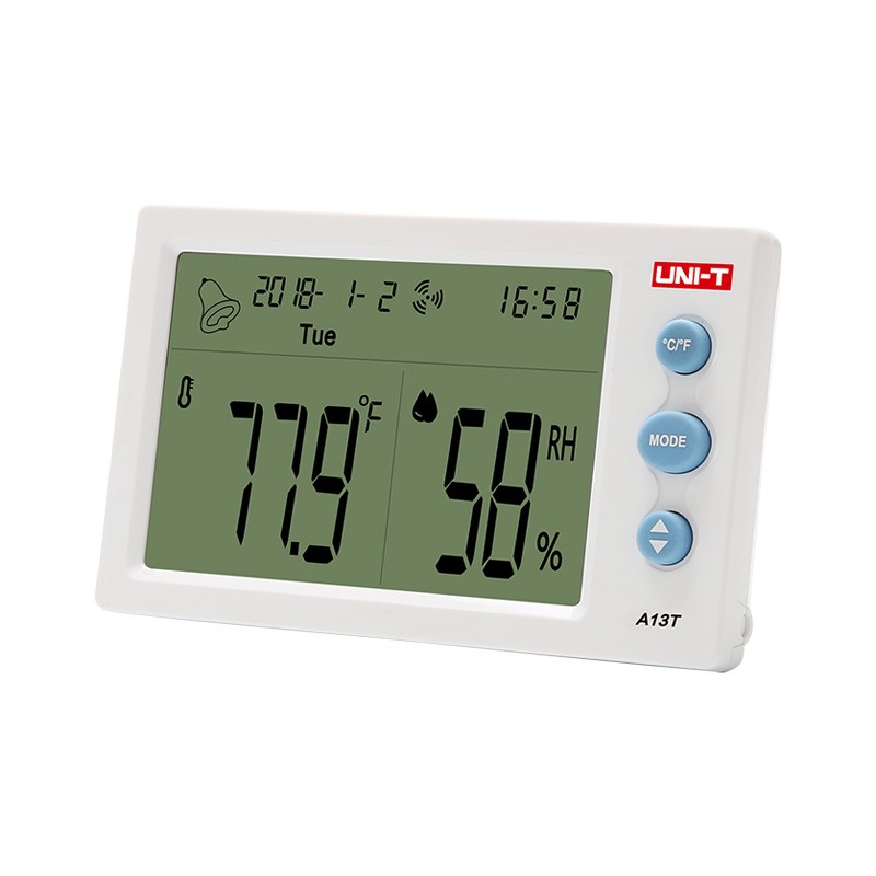 适宜的温湿度环境,一个我们曾经忽视的基本的生活品质要素。优利德全新A13T温湿度计,以多元化元素与便携使用的设计理念,兼备与众不同的外观及如沐春风的功能体验。标准的±1℃温度精度,时间日期星期温度湿度一屏全显,4.5英寸LCD大屏让你所以数据均可一览无遗。具备CE认证,一如既往的安全耐用。无论置于桌上还是挂在墙上,A13T都能随时为你提供精准的温度提醒,改善你的生活品质