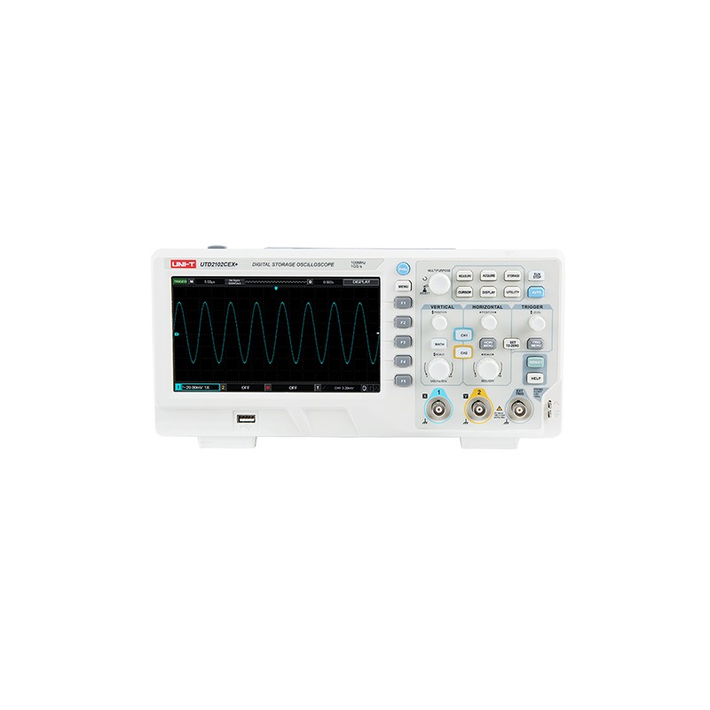 UTD2000CEX+是一系列经济型台式数字存储示波器,满足基础测量的关键需求,简洁清晰的前面板设计,更方便于用户操作。 UTD2000CEX+系列最高配置200MHz级别带宽,实时采样率为1GS/s(每通道),提供双通道等性能输出,存储深度64kpts。是一款针对广泛的数字示波器市场包括通信,半导体,计算机,仪器仪表,工业电子,消费电子,汽车电子,现场维修,研发/教育等众多领域的通用设计/调试/测试的需求而设计的示波器。 产品功能 可设置的快速AUTO策略 UTD2000CEX+配备有可设置的一键快速AUTO策略,用户可根据自身需求对通道设置/采样设置/触发设置/信号识别状态等进行设置,从而提高 AUTO响应速度,实现更流畅的人机交互体验。 宽屏显示,全新的交互界面 UTD2000CEX+进行了全新升级,配备有7英寸LCD宽屏液晶显示,极大地拓宽了显示空间,为此,UTD2000CEX+进行了软件再升级,极大的提升了显示效果,实现全新的人机交互界面给用户。
