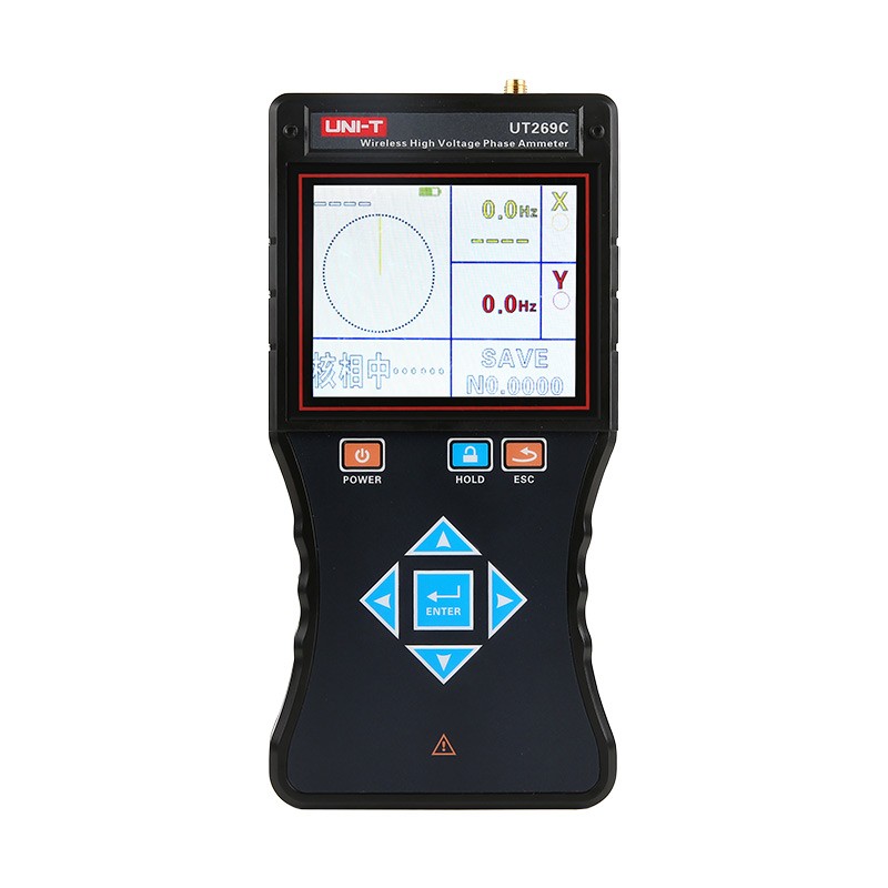 UT269C 无线高压核相仪 UT269C 无线高压核相电流表又名全智能无线高压核相仪、无线高压核 相器、无线高压核相电流表等,由无线接收器、钩式探测器、伸缩绝缘杆等组成。 钩式探测器丌同于传统核相仪需要连接金属探测挂钩,而是采用了一体化钩式设 计,B型产品还兼容高压电流测试功能,内置双层柔性线圈,可以直接挂在线路上 测试电流、核相,省时省力,可钩Ф168mm 的导线,或 168mm×245mm 的母 排;接收器采用3.5寸真彩液晶屏,同屏显示核相结果、电流、相位、频率等,有 向量图挃示,“X 信号正常、Y 信号正常、同相、异相”等语音提示,清晰直观。 空旷地面核相距离可达 160m 远,能对 220V~550kV 的电压线路全智能核相,其 中35kV以下的裸导线可以直接接触核相,35kV以上的裸导线采用非接触式核相, 非接触核相是将钩式探测器逐渐靠近被测导线,当感应到电场信号时就可以完成 核相,这样无需直接接触高压导线,更加安全!本核相仪同时具有高压验电器、 高压相位表、高压相序表的功能,可以用于验电、相序测试,变压器组别判断等 UT269C型的X探测器还具有高低压电流、漏电流测试功能,电流测量范围为 0~20000A,同时满足核相、电流、漏电流、相位、相序、验电测试;也可以用 于漏电巡查:将具有测试电流功能的X探测器钩在电缆上,沿线巡查,若接收器 由有较大电流显示突变为很小电流或无电流显示,该点即为电缆漏电点。