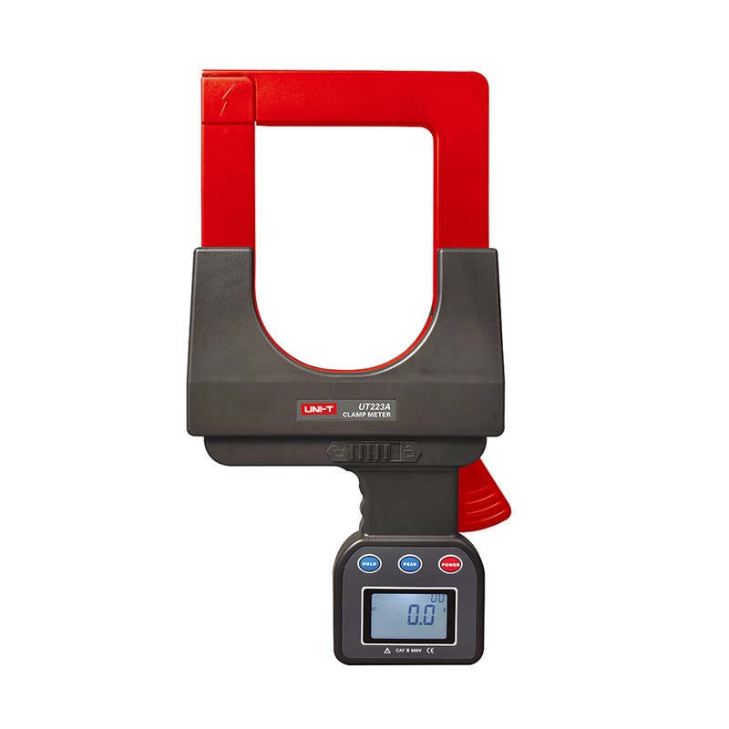 UT223A 大口径钳形电流表 UT223A大口径钳形电流表是专为测量交流电流、电流而精心设计制造的,采用**CT技术及数字集成技术,大口径(108mm×148mm:可钳φ108mm电缆或160mm×4mm扁钢地线,广泛用于电缆漏电及变压器接地扁钢漏电电流检测。 | UT223A产品主要特点 泄漏电流量程:AC 0.0A~4000A 钳口开口尺寸108mm×148mm,并配有锁栓(锁住钳头不能张开) 4位LCD数字显示,自带背光适用于昏暗场所使用 自动量程,每秒2次采样速率 PEAK测试:冲击电流峰值保持功能 可手动储存/查阅多达99组数据 含RS232接口,实现所存数据上传电脑,便于保存分析数据 数据保持功能,方便保持测量结果,随时读取 自动关机,降低电池消耗 过量程提示、低电压提示 |