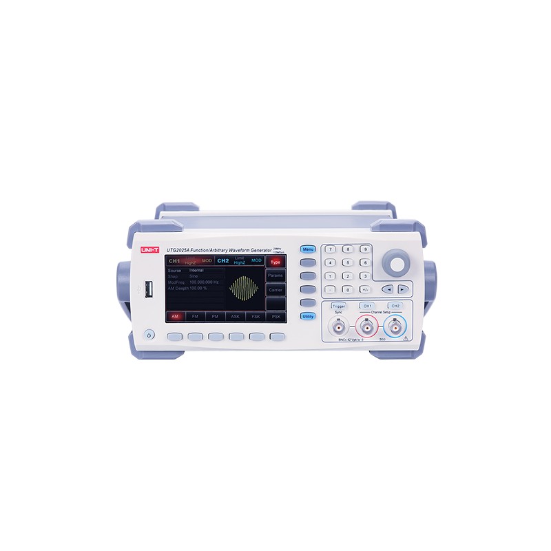 UTG2000A系列双通道函数/任意波形发生器,最大输出频率25MHz, 125MSa/s采样率,14bits垂直分辨率。等性能双通道独立输出,具备调制、扫频、Burst、等多种复杂波形的产生功能。标配USB Host、USB Device接口,便捷高效的操作界面、优越的技术指标及人性化的图形显示。 产品功能 多种波形信号 双通道有多种基本波形可选择:正弦波、方波、斜波、脉冲波、噪声、直流电压、任意波形 多种调制功能 调制类型:AM、FM、PM、ASK、FSK、PSK、PWM 扫描功能 扫描类型:线性、对数 猝发功能 猝发类型:N周期、门控、无限 方波信号 方波信号占空比&相位可调 噪声信号 固定带宽为60MHz的噪声信号 技术参数