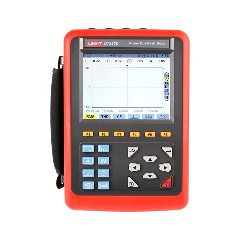UT285C 电能质量分析仪 UT285C电能质量分析仪是我公司精心研制的一款专为现场测试的三相、多功能、智能化、人机操作简洁的综合型测试仪器。具有容易使用,超大液晶彩屏显示,高分辨率,中英文双语操作界面,防振结构外壳等特点。可同时测量4路电流(ABC三相及中性线电流),4路电压(ABC三相电压及中性线对地电压)、电流电压的峰值、一段时间内的最大最小值、三相不平衡度、短时电压闪变、变压器K因数、有功功率、无功功率、视在功率、功率因数、位移功率因数、有功电能、无功电能、视在电能、谐波比、总谐波失真度等;显示电流电压的实时波形、相量图、谐波比柱形图;动态捕捉电压电流瞬时变化,监测启动电流,监测各电力参数并生成告警列表,长时间记录测试 数据并生成趋势曲线图等功能。 产品性能特点 波形实时显示(4路电压/4路电流)。 电压和电流真有效值。 电压直流成份。 电流和电压峰值 电流和电压半周期有效值的最大/最小值 相量图显示 各相谐波的测量,达50次谐波 柱形图显示各相电流和电压的谐波含有率 总谐波失真度(THD) 各相有功/无功/视在功率值及总值 各相有功/无功/视在电能值及总值 变压器K因数 功率因数(PF)和COSφ位移功率因数(DPF) 短期电压闪变 三相不平衡(电压和电流) 电流钳配件