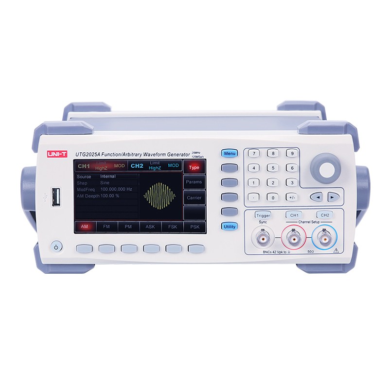 UTG2000A系列双通道函数/任意波形发生器,最大输出频率25MHz,125MSa/s采样率,14bits垂直分辨率。等性能双通道独立输出,具备调制、扫频、Burst、等多种复杂波形的产生功能。标配USB Host、USB Device接口,便捷高效的操作界面、优越的技术指标及人性化的图形显示。 性能特点: 多种波形信号 双通道有多种基本波形可选择:正弦波、方波、斜波、脉冲波、噪声、直流电压、任意波形