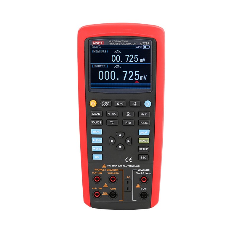 UT725 多功能过程校准仪 UT725是一款高性能、高精度、手持式、多功能过程校准仪。具有达到0.02%的高精度的直流电流电压输出和测量功能,可对多种电性能和物理性能参数进行测量和输出,具有自动步进和自动斜坡输出功能,可用于快速线性度检测;存储功能使得系统设置更加快捷;数 据传输功能使用户可快速进行测试通讯。支持两路信号处理,屏幕上部可显示测试电压、电流(环路供电)、电阻、压力。屏幕下部可显示测量或输出的电压、电流、频率、电阻、压力,以及以温度形式显示的热电阻(RTD)、热电偶(TC)。 | UT725产品主要特点 输出和测量精度高达0.02% 具有百分比输出功能,可通过相应的按键快捷地输出不同百分比的输出值 自动步进和斜坡输出可进行快速线性检测 给变送器提供回路电源的同时进行mA测量 测量及输出10种热电阻和12种热电偶信号 保存频繁使用的设置状态,方便以后使用 数据传输功能使用户可快速进行测试通讯 屏幕亮度可调以满足不同场所使用 可对镍氢充电电池充电,不用频繁换电池 |