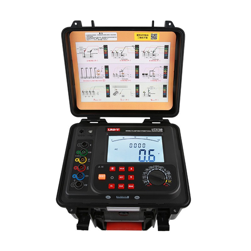UT575B 双钳多功能接地电阻测试仪 UT575B双钳多功能接地电阻测试仪是一款专为现场测量接地电阻、直流电阻、土壤电阻率、接地电流、接地电压而精心设计制造的高端仪表。仪表采用先进数字处理技术,具有二线法、三线法、四线法、选择法、双钳法等各种测量方法选择,钳头采用大口径电流钳设计,可测量大尺寸接地引下线的接地电阻值,可灵活测量单点和网状接地等各种复杂接地结构的接地电阻值,测量并联接地系统时无需断开任何并联接地极,极大地提高了测量的方便性,为接地性能测试提供了**的解决方案。仪表具有存储功能,时钟功能,自动存储含有日期时间的测试结果2000组。并支持安卓系统的蓝牙通讯功能及USB接口,存储数据通过USB接口上传PC机,可以实现历史记录数据读取、查阅、保存、报表、打印等功能。 广泛应用于电力、电信、气象、油田、建筑、防雷及工业电气设备等行业。