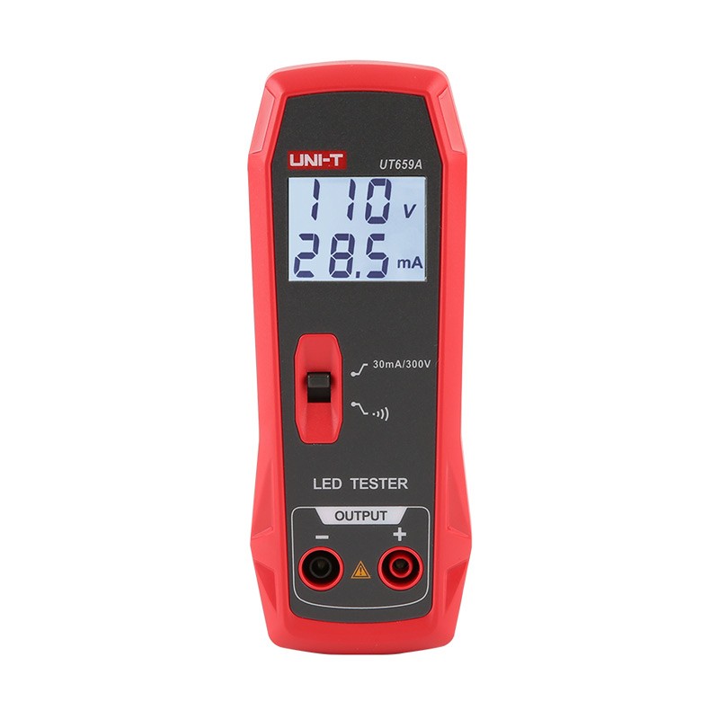 UT659A LED灯测试仪供电支持全电压(85V~265V,50Hz/ 60Hz)输入,上电后等待一分钟再使用,以确保电压输出稳定;使用30mA/300V档进行LED测试时,可自动识别LED极性,输出电压根据所测LED灯的导通电压降自适应调节;内部芯片具体有过流、过载保护功能;