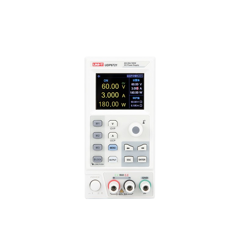 UDP6720系列开关直流电源分别支持60V/5A、60V/8A的宽范围输出,输出功率比高达3.0,大大提高了产品的应用范围,减小电源设备的采购投入。产品全系列采用高清LCD显示,标配标准RS232通信接口,支持SCPI协议,方便远程控制。其远端补偿模块,可避免负载线上的压降引起的测试不准确问题;具有低纹波噪声、高精度电压/电流输出及多重保护功能,保证产品工作的可靠性。 产品功能 多功能交互显示 UDP6720系列为用户提供了功能丰富,操作简单的人机交互界面,应用了2.8‘’高清显示屏,可以实时显示电源当前的设定输出电压/电流、实际输出电压/电流和保护输出电压/电流值;同时用户还能够便捷的进行系统的设置,此人性化设置可以满足工程师测试中的多种应用需求。 列表模式&延时器功能 列表模式可设定48组任意电压,电流输出,输出间隔时间可调,还提供输出波形预览与输出循环设置,实现真正可在线编程功能。 延时器功能提供48组开关状态预设,还提供保护电压阈值设置。 Auto Range功能 UDP6720系列电源具有同类**的宽范围电压/电流使用率,可以在固定功率下,实现不同电压和电流的组合输出,单台电源即可满足高压低电流或是低压大电流的不同待测物的测试,大大提高了应用范围。 远端补偿功能 UDP6720系列提供远端补偿功能,用户可以通过将负载端的电压信号接入到远端补偿端子中,来激活此功能。补偿功能的应用使得输出负载端电压不再受电流大小和负载线分压的影响,可使输出电压始终维持设定值输出,最终保证了输出电压的精度。 RS232通信 UDP6720系列标配RS232通信接口与上位机软件,用户利用该软件可以轻松的对电源系统进行远程控制,进行输出电压、电流的设置及数据保存。 技术参数