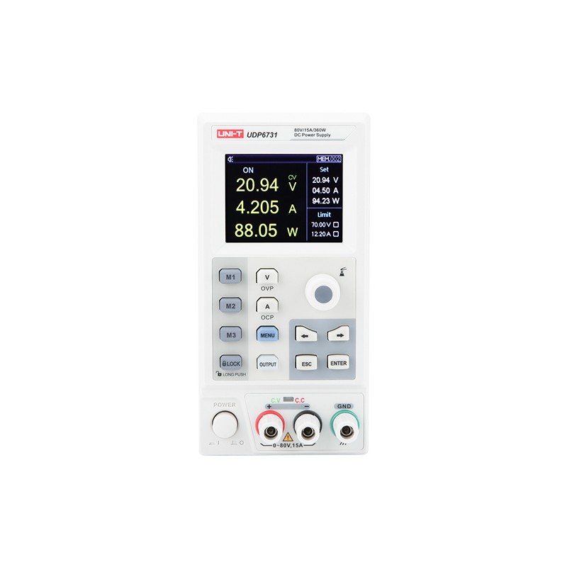UDP6730/UDP6731宽范围可编程开关直流电源分别支持80V/15A,40V/30A的宽范围输出,具有同类**的宽范围电压/电流使用率,大大提高了应用范围。360W的输出功率,自动控制电压和电流的变化率,功率比达到三倍之多,全系列采用高清LCD显示,标配RS-232通信接口,支持SCPI协议,方便远程控制。其远端补偿模块,可避免负载线上的压降引起的测试不准确问题;具有低纹波噪声、高精度电压/电流输出及多重保护功能,保证产品工作的可靠性。 产品功能 2.8'' LCD真彩液晶显示 UDP6730系列为用户提供了功能丰富,操作简单的人机交互界面,应用了2.8'' LCD 高清液晶显示屏,读数一目了然,操作简单易懂。不仅可以实时显示电源当前设定的输出电压/电流、实际输出电压/电流以及保护输出电压/电流值;同时用户还能够便捷的进行系统的设置,此人性化设置可以满足工程师测试中的多种应用需求。 列表模式&延时器功能 列表模式可设定48组任意电压,电流输出,输出间隔时间可调,还提供输出波形预览与输出循环设置,实现真正可在线编程功能。 延时器功能提供48组开关状态预设,还提供保护电压阈值设置。 完全数字控制,更宽范围调节 UDP6730/UDP6731开关直流电源具有同类**的宽范围电压/电流使用率,可以在固定功率下,实现不同电压和电流的组合输出,单台电源即可满足高压低电流或是低压大电流的不同待测物的测试,自动控制电压和电流的变化率,功率比达到三倍之多,大大提高了应用范围。 远端补偿设置最大1V,更加准确测量 UDP6730系列提供远端补偿功能,用户可以通过将负载端的电压信号接入到远端补偿端子中,来激活此功能。补偿功能的应用使得输出负载端电压不再受电流大小和负载线分压的影响,可使输出电压始终维持设定值输出,最终保证了输出电压的精度。 RS232远程通讯,更加方便控制 UDP6730系列标配RS232通信接口与上位机软件,利用该软件用户可以轻松的对电源系统进行远程控制,进行输出电压、电流的设置及数据保存。 技术参数