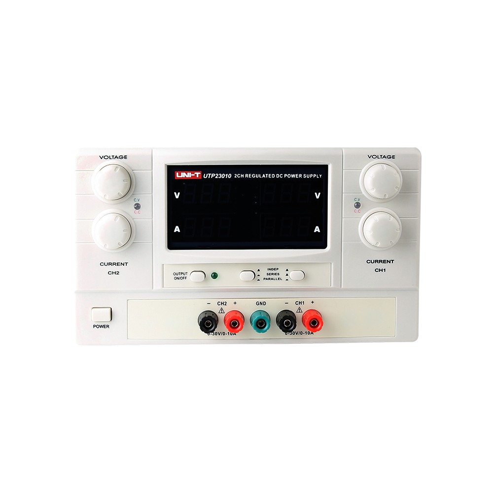 UTP23010是一款双路大功率直流稳压电源,每路有30V电压输出和10A电流输出。在跟踪模式状态下,CH1与CH2两个输出端可以自动连接成串联模式或并联模式,而不需另外在输出端连接任何导线。 UTP23010具有极高的稳定性和高可靠性,是科研部门、大专院校及企事业单页等需要高稳定性直流供电场合的理想选择。