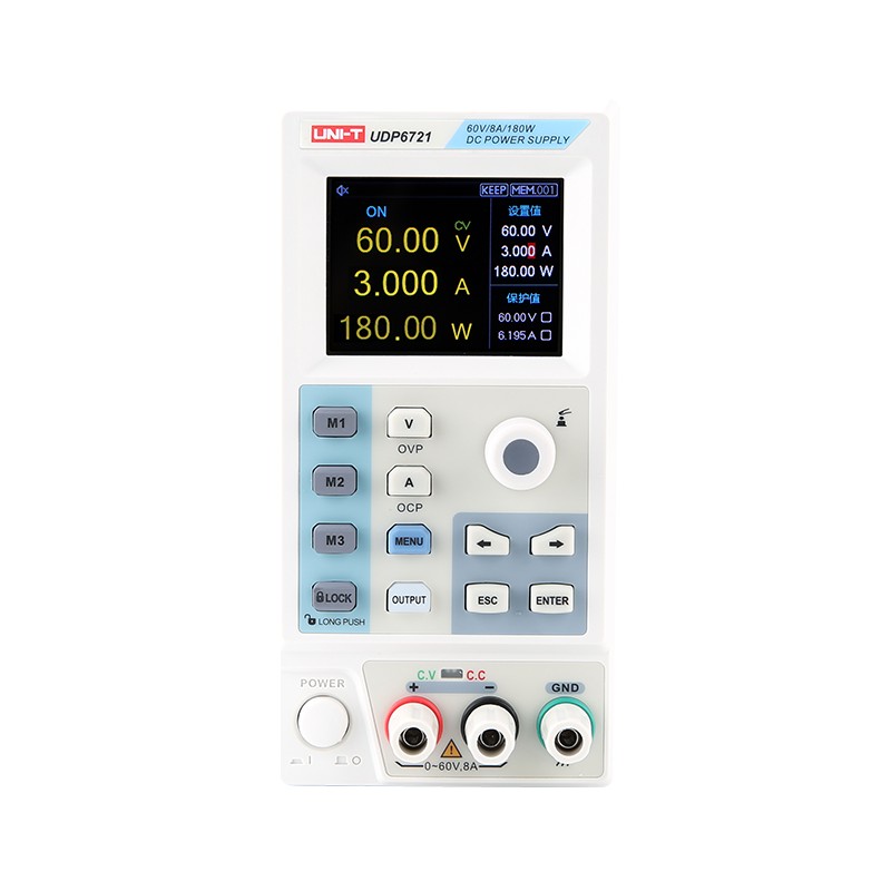 UDP6720系列开关直流稳压电源分别支持60V/5A、60V/8A的宽范围输出,输出功率比高达3.0,大大提高了产品的应用范围,减小电源设备的采购投入。产品全系列采用高清LCD显示,标配标准RS232通信接口,支持SCPI协议,方便远程控制。其远端补偿模块,可避免负载线上的压降引起的测试不准确问题;具有低纹波噪声、高精度电压/电流输出及多重保护功能,保证产品工作的可靠性。