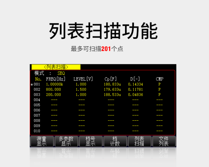 | L:0.00001uH ~ 99.9999kH; C:0.00001pF ~ 9.99999F; D:0.00001 ~ 9.99999; Q:0.00001 ~ 99999.9; θd:-179.999° ~ 179.999°; θr:-3.14159 ~ 3.14159; DCR:0.00001Ω ~ 999.999MΩ; Δ%:-999.999% ~ 999.999% | V/I 监视 | 有 | 测试端配置 | 5 端 | 清零功能 | 开路、短路、负载 | 列表扫描 | 201 点,扫描参数:测试频率、AC 电压、AC 电流、DC BIAS 电压、DC BIAS 电流 | 等效方式 | 串联,并联 | 量程方式 | 自动,保持 | 触发方式 | 内部,手动,外部,总线 | 平均次数 | 1~255 次 | 数学运算 | 直读,△ABS,△% | 延时 | 触发延时,步进延时:0—60.000s,1ms 步进 | 比较器 | 10 档分选,BIN1-BIN9,NG,AUX、档计数功能、PASS,FALL 前面板 LED 显示 | 存储 | 内部:100 组仪器内置测试设定文件,201 次测试结果, USB 存储器:设定文件、BMP 图像、CSV 数据文件 | 接口 | RS232、HANDLER、USB HOST、USB DEVICE、网口 | 判定功能 | PASS / FAIL | 尺寸 | 350*215*88mm | 重量 | 4.65kg | 其它功能 | L-RDC 同时测试,软电源开关,一键截屏功能,数据记录功能 | 上位机功能 | 上位机 统计分析 |