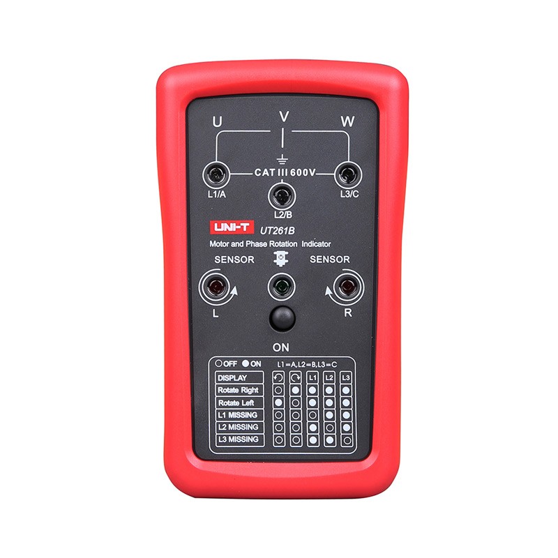 UT261B是一款便携式手持式仪表。设计用于判断三相系统的相序和侦测马达的旋转磁场方向。非接触式旋转磁场测试,无需连接测试线,只需将仪表放在马达上方,与马达转动轴平行即可确定马达运行过程中的转向。如果您经常接触到马达,那么这款测试仪表就是你的工具袋中的必备工具。