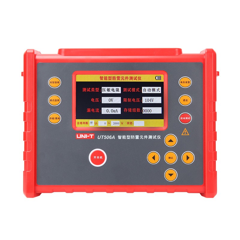 UT506A智能型防雷元件测试仪,用于避雷器、防雷器、浪涌保护器、压敏电阻、金属陶瓷放电管等性能测试的专用仪表。采用充电功能离线使用克服了传统产品要插电使用不方便现场操作的缺点。电压输出2000V,应用领域更为广泛,使用高压短路保护,自动放电功能,仪表可靠安全耐用。同时采用豪华大彩屏显示,具备数据存储、数据查阅、自动关机、USB数据传输等功能。量程广、分辨率高、操作简便、易于携带,是电力领域必不可少的一款测量仪表。