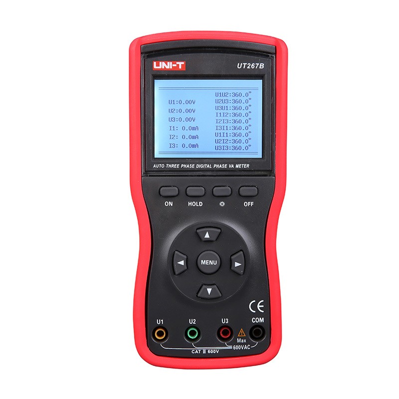 UT267B智能型三钳数字相位伏安表选用**型材料设计制作外壳模具,配有的防振、防滑、高绝缘护套,采用240dots×160dots LCD显示器,所有参数同屏显示,一目了然,尽显精美豪华外观。适用于电力、石化、冶金、工矿企业、科研院校、计量部门等。尤其适用于电能计费系统及继电保护系统,其供电营销部门的电能计量、用电检查、电力稽查,生技部门的装表接电 、继电保护、差动检测、启动试验、变电检修,或电力实训、数字相位伏安表等,技能比武等