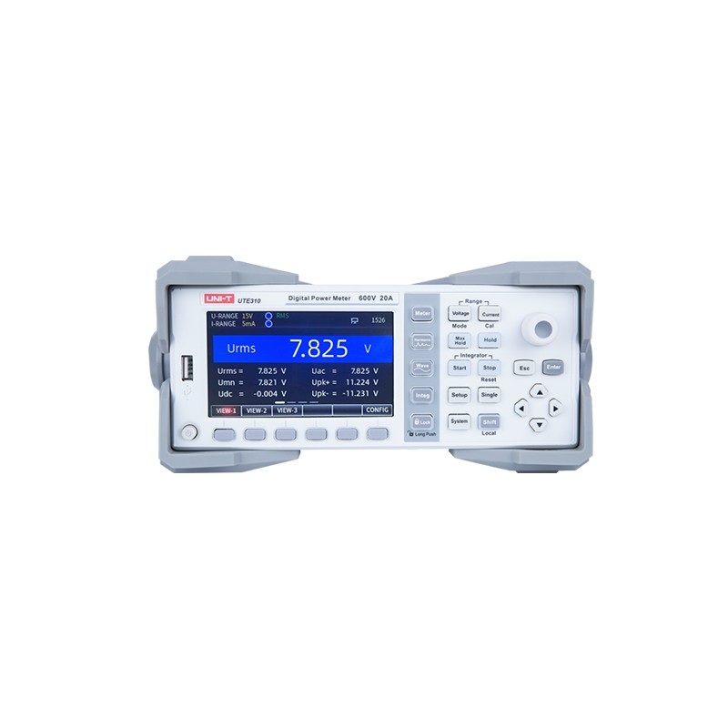 UTE310数字功率计,集电压、电流、功率、功率因数、频率等诸多功能为一体。UTE310具有 0.1%的功率测量精度,1MSa/s的采样率,0.1s最快数据更新速度,电流测量范围 50μA—20A 可满足用户从小电流大电流的测量需求;同时具备 USB、RS-232、LAN、GPIB(选配)等接口满足用户不同的测试通信需求。 产品功能 常规测量功能 交直流电压:15V,30V,60,150V,300V,600V 交直流电流:5mA,10 mA,20 mA,50 mA,100 mA,200 mA,500 mA,1A,2A,5A,10A,20A 交直流功率:75mW~1200W 频率测量:0-300kHz 积分功率:0~10000小时 四则运算:A+B,A-B,AxB,A/B,A/B^2,A^2/B 谐波测量:1-50次 DAC输出:U,I,P,S,Q,λ, Ø ,fU,fI,Upk,Ipk,WP,WP±,q,q±,MATH 多种显示风格可切换 三种显示风格; VIEW-1:Meter常规测量界面 VIEW-2:同时显示14个参数 VIEW-3:数学运算界面 波形显示 可观察测量信号的峰峰值和波形变化情况 前面板介绍 一屏多显数据功能; 图形化的用户界面,操作简单方便; 更有帮助系统,方便信息获取; 支持U 盘存储,便于数据文件管理; 支持系统在线升级,便于产品的系统维护升级。