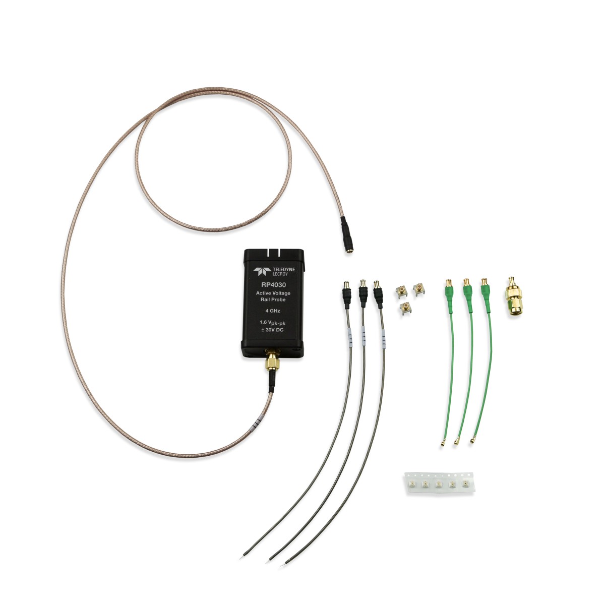 RP4030 电源探头 概述 RP4030探头具有高达±30V的内置偏置范围、1.2倍的低衰减比和高达50 kΩ的DC输入阻抗。这样的技术指标使工程师可以直接设置等于DC电压的偏置,让DC信号显示在示波器屏幕的中间,不需要额外的隔直设备,可以使用高达5mV/div的垂直灵敏度,以观察非常小的电源纹波。RP4030有4GHz的带宽,是目前市场上同类产品的两倍,和HDO9404高精度示波器**配合,进行电源完整性测试。 RP4030具有丰富的前端和附件,标配的36” (914mm)SMA-MCX线缆,可以接4GHz的MCX焊接前端、4GHz MCX PCB连接前端,或者通过3GHz MCX- U.FL连接U.FL PCB测试点,也可以选择点测前端。高带宽、小体积的焊接前端和U.FL PCB连接前端(3mm x 3mm)是探测空间狭小的移动手持系统的**选择。针对其他不同的测试,也可以选择购买其他的附件。 |