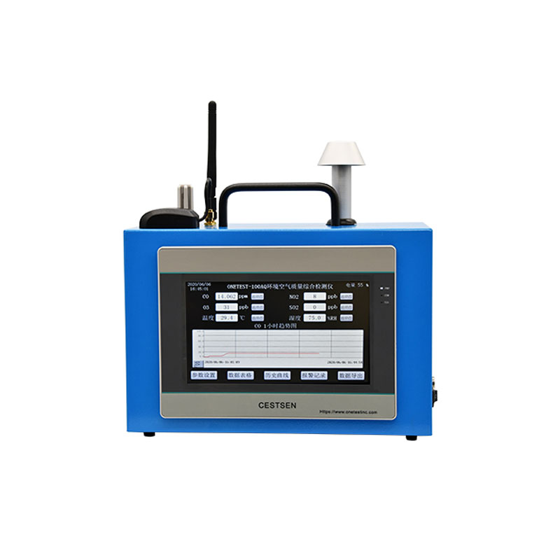 ONETEST-100AQ多参数环境空气质量检测仪是用于衡量室内外环境的综合检测仪器,如:公寓、酒店、办公室、机场、公园、林业调查、生态环境评估等领域空气质量的仪器,主要检测粉尘PM2.5、PM10、 温度、湿度以及气体TVOC、臭氧、一氧化碳、二氧化硫、一氧化氮、二氧化氮等,同时可选配气象参数或监测。采用7寸触控型液晶显示屏,可同时多参数显示数据、曲线、报警值等,并可设置存储间隔,60MHz内存,可使用U盘导出数据,配备专用PC分析软件。选配GPRS功能,将数据上传至云监测平台,实现数据发布功能。 产品特点 粉尘测量采用万仪科技第三代的光散射原理粉尘测量技术测定环境中的PM2.5、PM10,具有响应时间快、极易维护等特点,结构采用了空气动力学原理粒子切割器,实现自动实时采样,并适合长期在线使用;气体浓度的检测采用了国外进口的电化学和红外传感器,采用零气发生器和标准气体对传感器进行校准,,内存60M内存,可将数据实时存储,并以U盘导出,实现数据、曲线、自动绘制,以便于分析。万仪科技公司通过ISO9001和ISO14001体系认证,为广大客户提供精确易用的测量评估设备。 技术指标